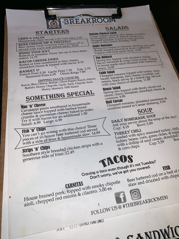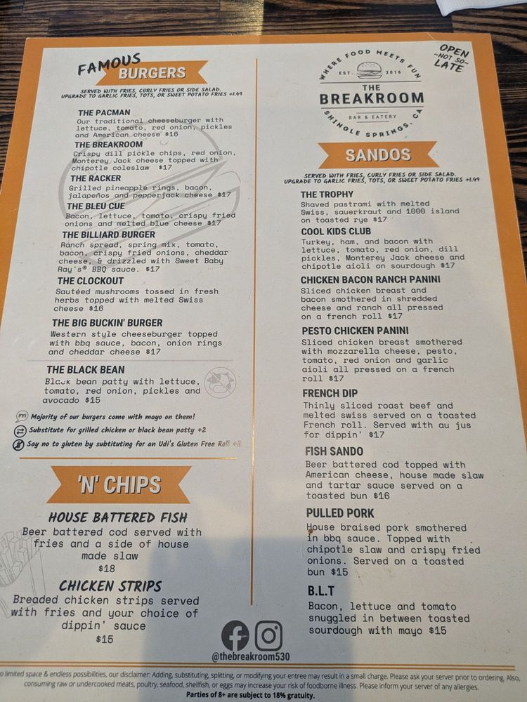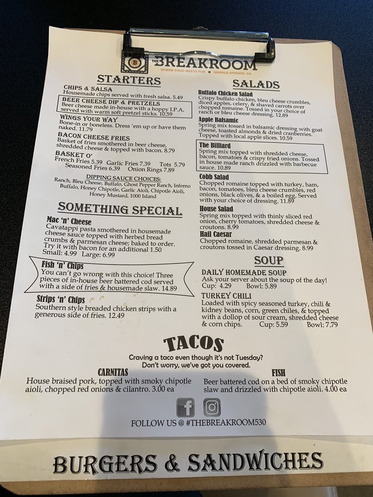 Introducing The Breakroom, a vibrant American eatery nestled in the heart of Shingle Springs, CA. This delightful spot caters to a variety of tastes with a menu that shines with must-try items like their acclaimed burgers, fish and chips, and fresh buffalo chicken salad. The atmosphere is casual yet inviting, making it a go-to destination for lunch or dinner, and even a fun evening with pool tables and dart boards.